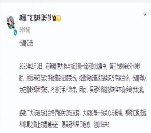 除此之外,新疆男篮还传来一则坏消息,新疆男篮官方宣布,主力内线吴冠希左膝髌韧带损伤,将缺席本赛季剩余比赛。值得一提的是,这已经是吴冠希连续两个赛季因伤报销,上赛季他遭遇右膝重伤接受手术,而本赛季则是左膝再次重伤,玻璃人属性越来越明显。本赛季至今,吴冠希代表新疆男篮出战23场比赛,场均18分钟贡献6.3分3.7篮板,上赛季只打了8场比赛,场均16.9分钟贡献5.8分5.3篮板1.8助攻,两个赛季只打了31场比赛,在手握C类大合同的情况下,吴冠希这样的出勤率真是让人非常失望。