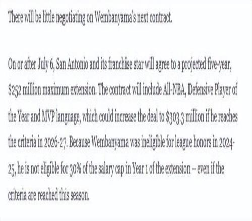 由于文班亚马在2024-25赛季没有资格参评联盟奖项,即便本赛季达标,他续约第一年的薪资也无法占到工资帽的30%。