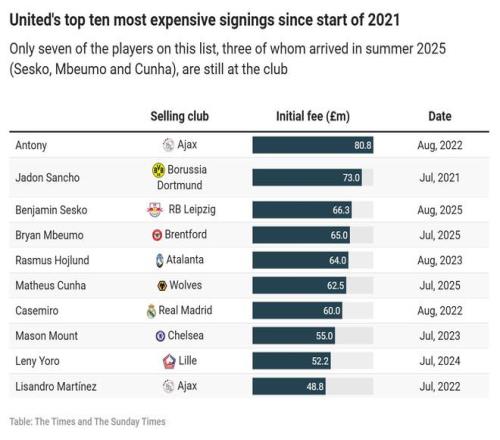 报告指出,从2021年初至2025年底,曼联在转会市场上的净支出达到7.94亿欧元(约6.92亿英镑)。这一数据凸显了球队在此期间竞技表现不佳所付出的高昂代价。根据《2025俱乐部财务与投资格局报告》,净支出排名第二的是切尔西足球俱乐部(6.56亿英镑),第三为阿森纳足球俱乐部(5.87亿英镑)。
