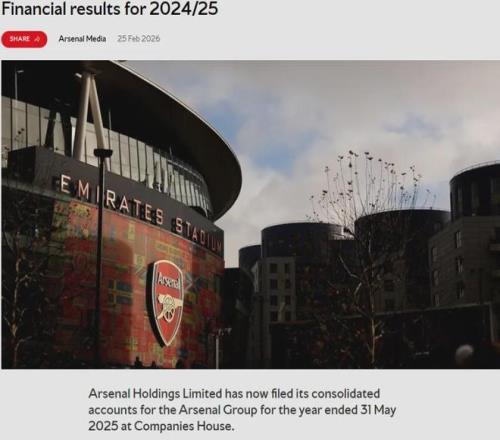 官方:阿森纳控股有限公司公布了俱乐部24-25赛季的财报。